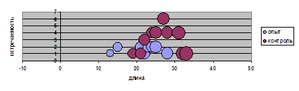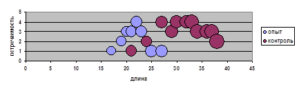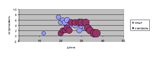 соплодия варьирует от 20 до 25 мм. (опыт) и от 24 до 34 мм. (контроль). У контрольных растений чаще всего встречаются соплодия с длиной 26 мм., а у опытных растений с длиной 23-24 мм. (диаграмма 15)