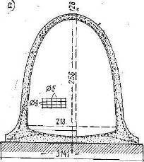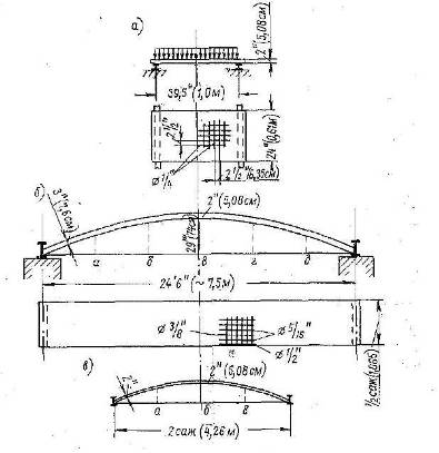 в 1886 г.: а – железобетонная плита; б – железобетонный свод пролётом 7,5 м; в – то же, 4,26 м.