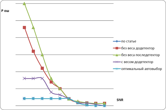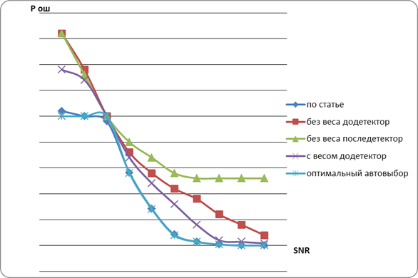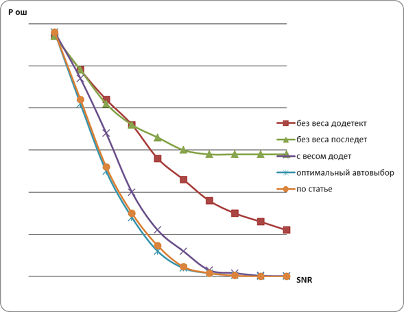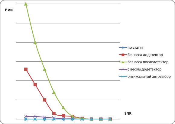 эти действия мы можем добиться Р ош равной , а при SNR больших 6db Р ош достигает . Данный метод сложнее реализовать так как нужно непрерывно вести анализ