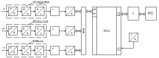 вимірюються, перетворюються у відповідному вимірювальному каналі за допомогою
