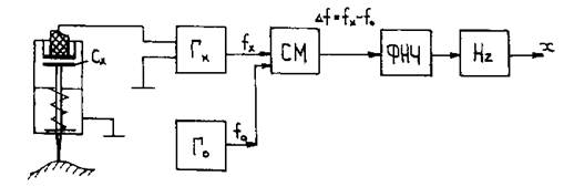 частоти подаються на вхід змішувача, вихідна частота якого . Виміряна частотоміром