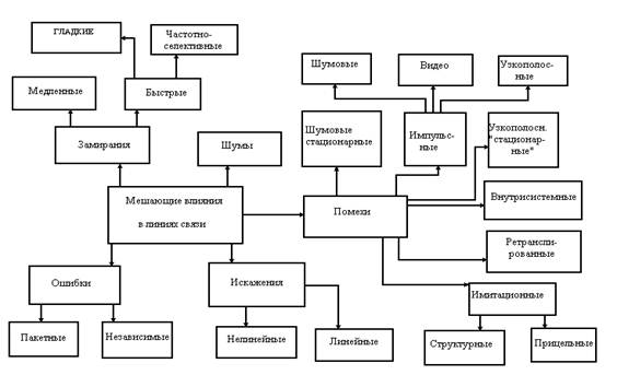 разделяют на шумы, помехи, замирания, искажения, ошибки (рис. 1). Обычно шумы