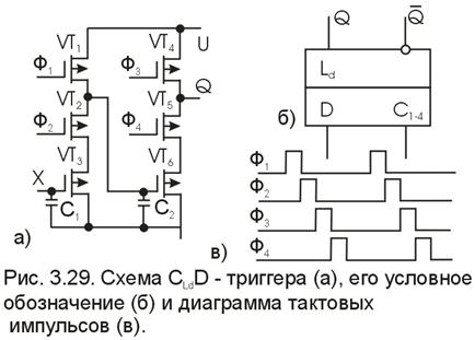 сдвинутых во времени импульсов. Затвор транзистора VT3 первого инвертора является информационным входом (входом D) триггера, а выход второго инвертора