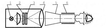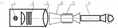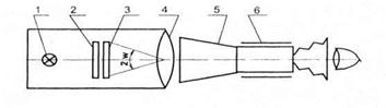 света; 2 - молочное стекло; 3 – тест-объект; 4 – объектив коллиматора; 5 –