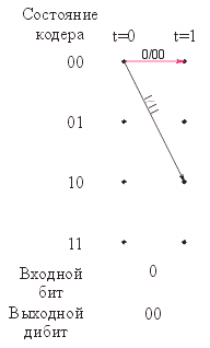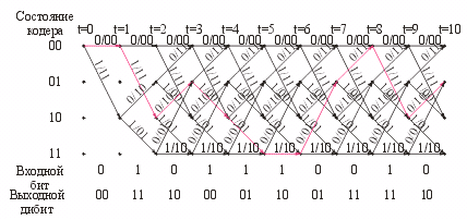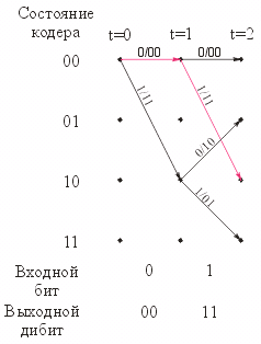 отмечен красным цветом). По данному пути, пользуясь диаграммой состояния треллис-кодера