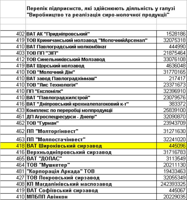 ПРИКЛАДІ ВАТ „ШИРОКІВСЬКИЙ СИРЗАВОД” ДНІПРОПЕТРОВСЬКОЇ ОБЛАСТІ