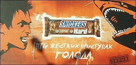 «Сникерсом». Слоган на плакате подтверждает визуальную информацию: При