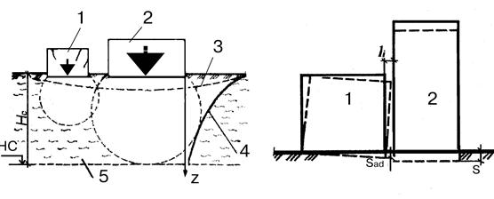 поблизу одна від одної: 1 - існуюча будівля; 2 – новозбудована; 3 - вирва осідання;