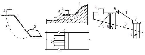 - контрбанкетом; б - контрфорсом; в - утримуючими конструкціями; 1 - поверхня схилу;